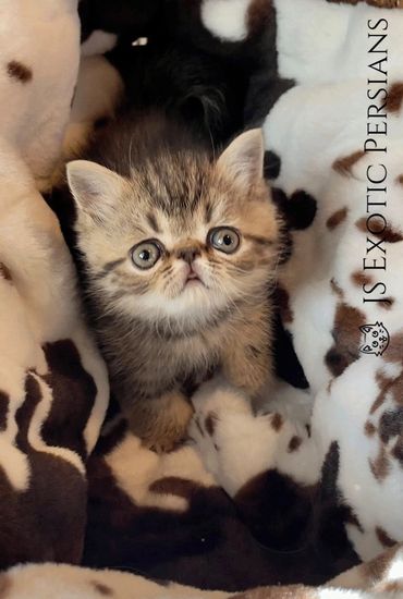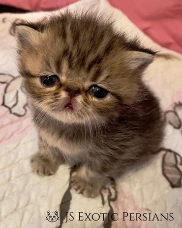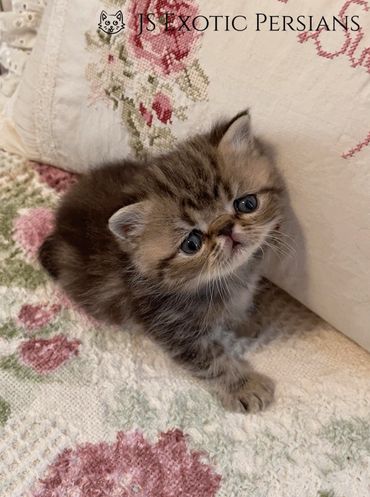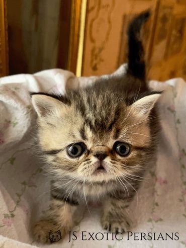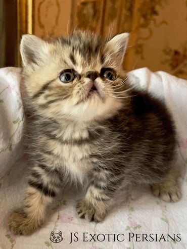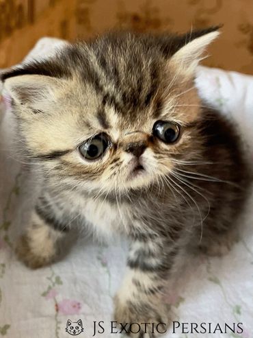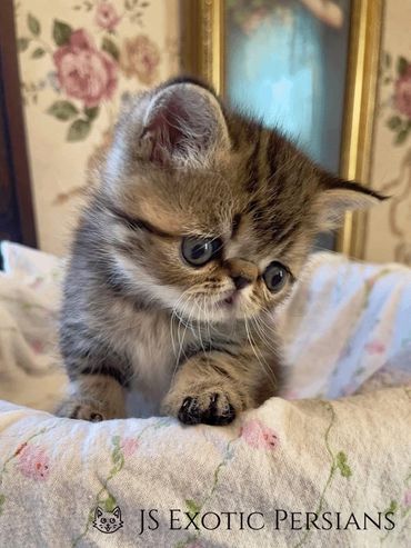 Jazzie is a striking male Exotic Shorthair with the classic charm of a brown tabby Persian. With his plush, teddy bear-like coat and expressive eyes, he's as handsome as he is charismatic. But it’s his personality that truly stands out—Jazzie is proving to be the confident leader of his litter. Outgoing and curious, he’s quick to explore new spaces and even quicker to figure things out. Smart and strong, Jazzie isn’t just bold—he’s thoughtful and observant, showing signs of a natural-born leader. Whether he's guiding his siblings on a playful adventure or cuddling up for some well-earned rest, Jazzie brings warmth, energy, and a spark of mischief wherever he goes.